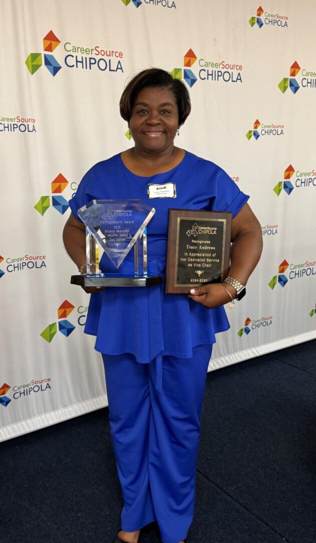 Chipley Mayor Tracy Andrews was recently recognized by CareerSource Chipola for her dedicated service as their Vice Chair for the 2024–2025 term. In honor of her service to the community, she received both the Hollingsworth 2025 Board Member of the Year Award and a special Appreciation Award.