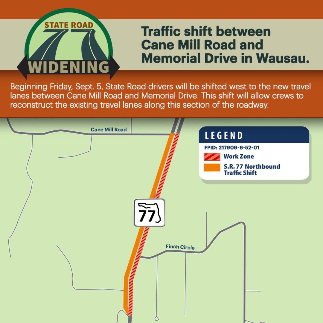The Florida Department of Transportation (FDOT) announced that beginning Friday, September 5, State Road 77 (S.R. 77) drivers will be shifted west to the new travel lanes between Cane Mill Road and Memorial Drive. This shift will allow crews to reconstruct the existing travel lanes along this section of the roadway. Signage will be in place to safely direct drivers through the work zone.