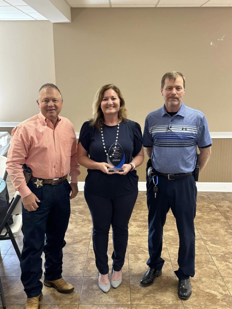 The Gulf Coast Children’s Advocacy Center (GCCAC) recently recognized Washington County Sheriff’s Office (WCSO) Investigator Duran Harrison as its Outlying County Investigator of the Year for his efforts to protect children and pursue justice in Washington County. Harrison’s work with the GCCAC’s Child Protection Team has led to 53 felony charges connected to child abuse and sexual violence cases. GCCAC expressed its gratitude for Investigator Harrison’s dedication, as well as the continued support of the WCSO and Sheriff Kevin Crews. Pictured above from left to right are WCSO Sheriff Crews, GCCAC Executive Director Lori Allen, and Investigator Harrison as he receives his award. [CONTRIBUTED]