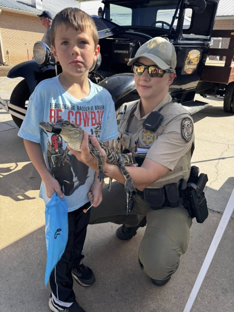 An FWC officer shows a young visitor a baby alligator during the Caryville Touch‑A‑Truck event. [CONTRIBUTED]