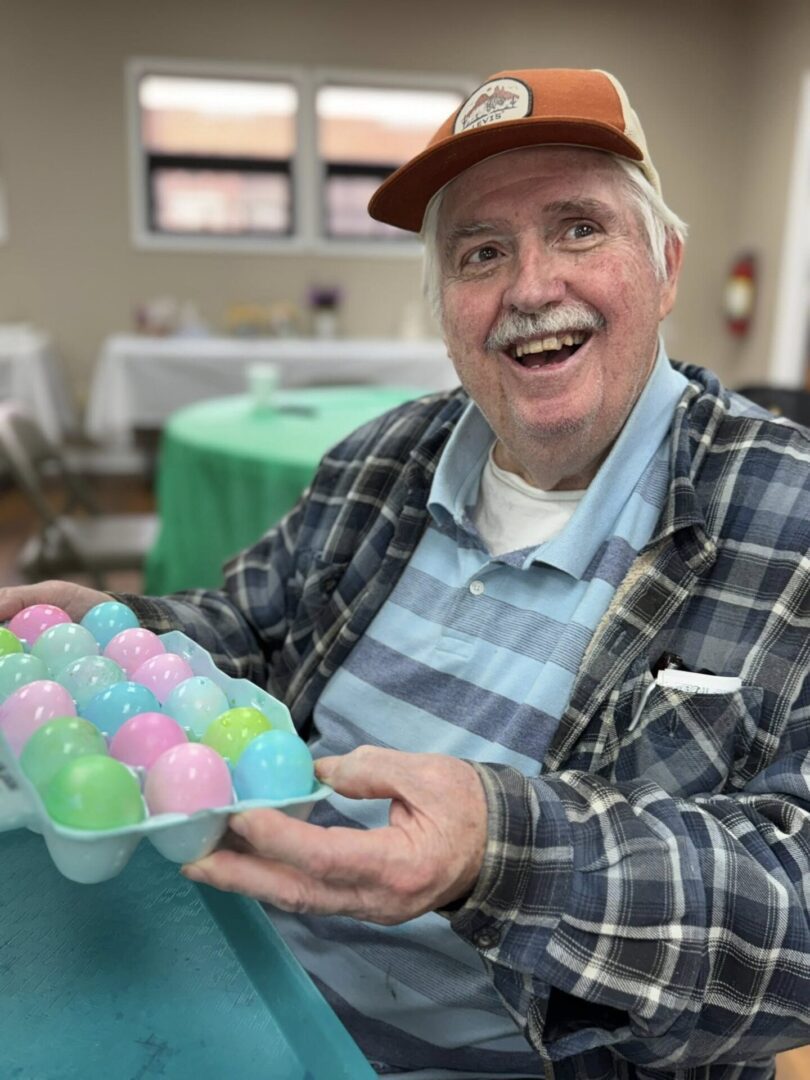 A senior from the Washington County Council on Aging shows off a carton full of brightly colored Easter eggs, part of last week’s holiday celebration at the center. [CONTRIBUTED]