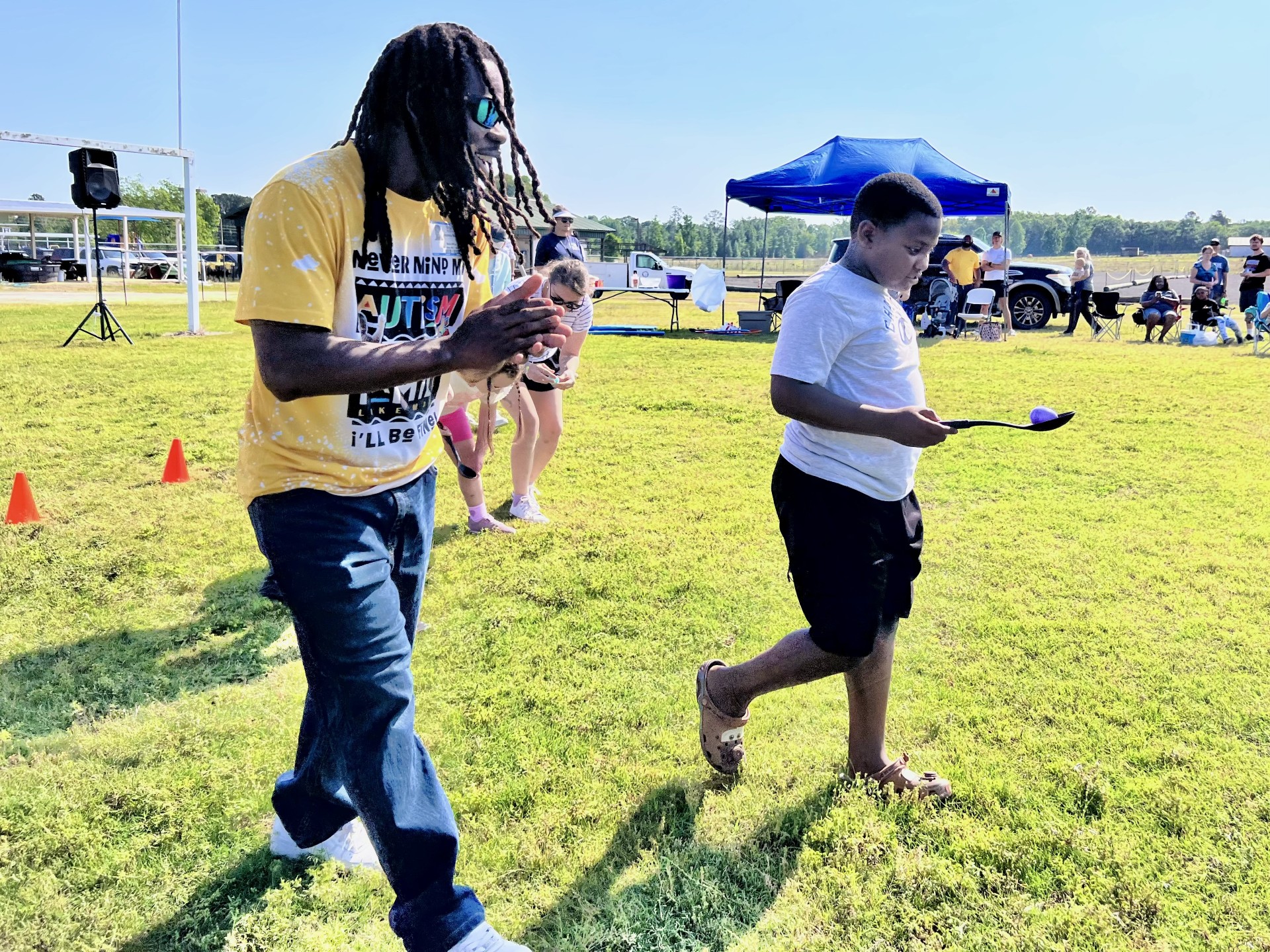 Joshua Blackmon cheers on his son, Joshua Blackmon Jr., during the egg and spoon relay, sharing an encouraging moment on the field. [ALI MORELAND | THE NEWS]