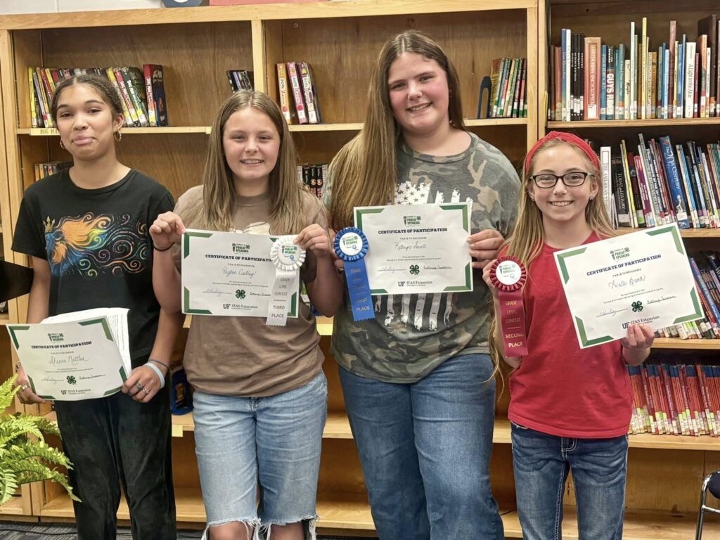 Standing from left to right, Shapira Nettles, Peyton Coatney, Kathryn Sewell and Avielle Brock, Vernon Middle School 6th grade 4-H Public Speaking winners, are pictured following the competition. [CONTRIBUTED PHOTO]